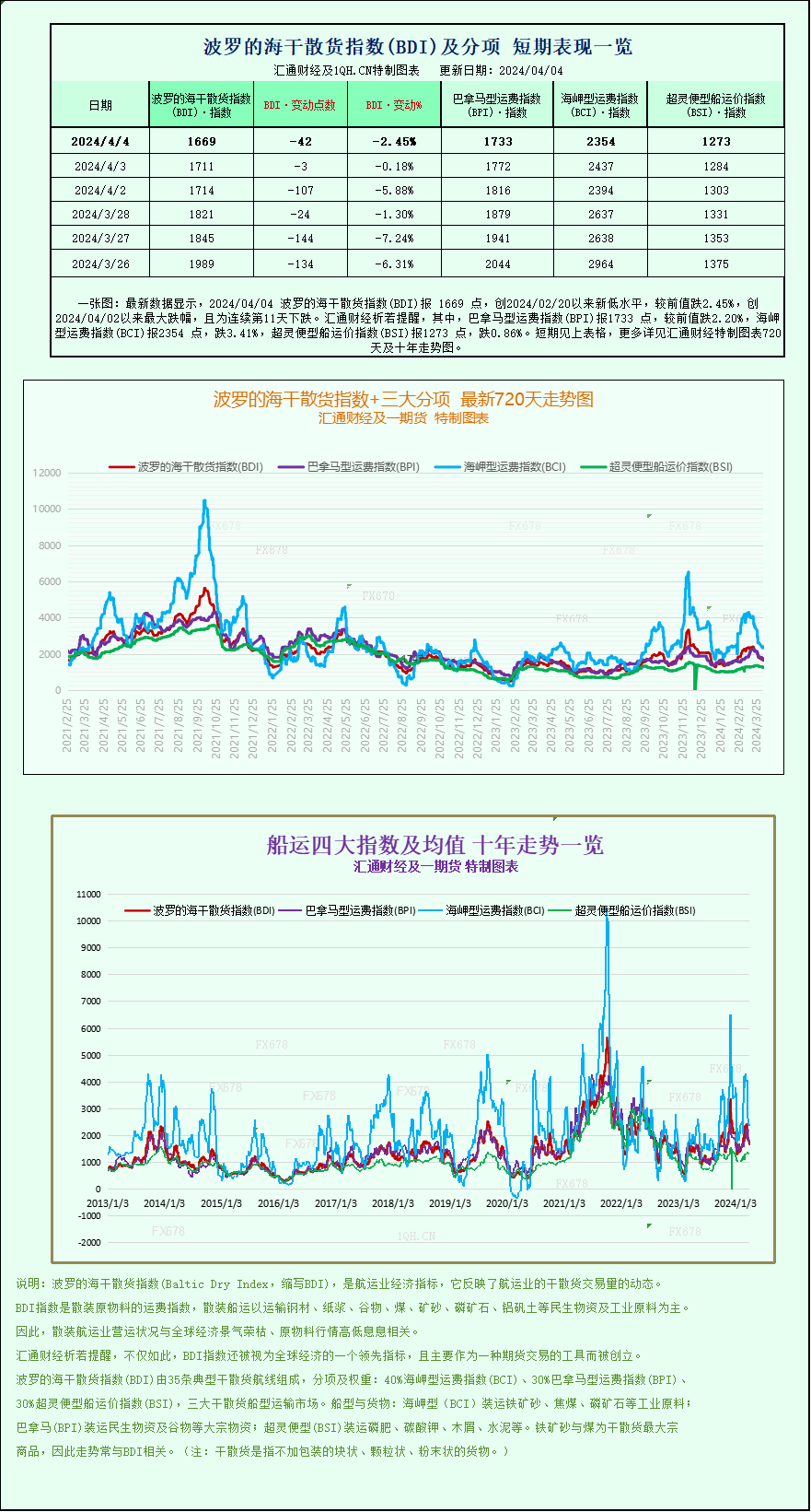 汇通财经APP讯——最新数据显示,2024/04/04 波罗的海干散货指数(BDI)报 1669 点,创2024/02/20以来新低水平,较前值跌2.45%,创2024/04/02以来最大跌幅,且为连续第11天下跌。其中,巴拿马型运费指数(BPI)报1733 点,较前值跌2.20%,海岬型运费指数(BCI)报2354 点,跌3.41%,超灵便型船运价指数(BSI)报1273 点,跌0.86%。波罗的海干散货指数+三大分项的最新720天走势图、十年走势图等详见汇通财经特制图表。