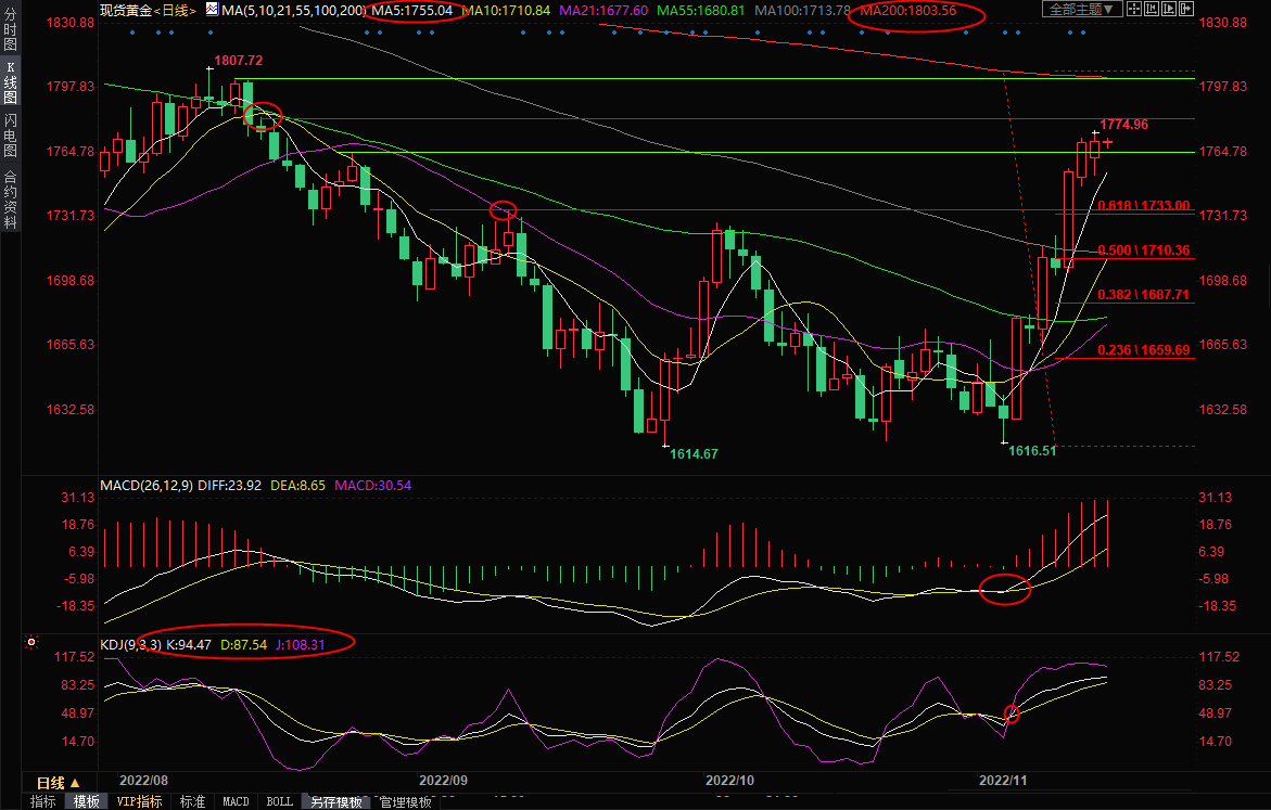 整体来看,美联储将放缓加息步伐的预期仍在短线支撑金价,金价短线仍有一定的冲高机会,关注8月16日高点1783.02附近阻力和200日均线1803.55附近阻力;当然,由于短线金价涨幅过大,KDJ已经发出超买信号,盘中仍需留意短线多单获利了结等因素引发短线回调走势的可能性,下方关注5日均线1755和9月12日高点1735.02附近支撑。北京时间10:26,