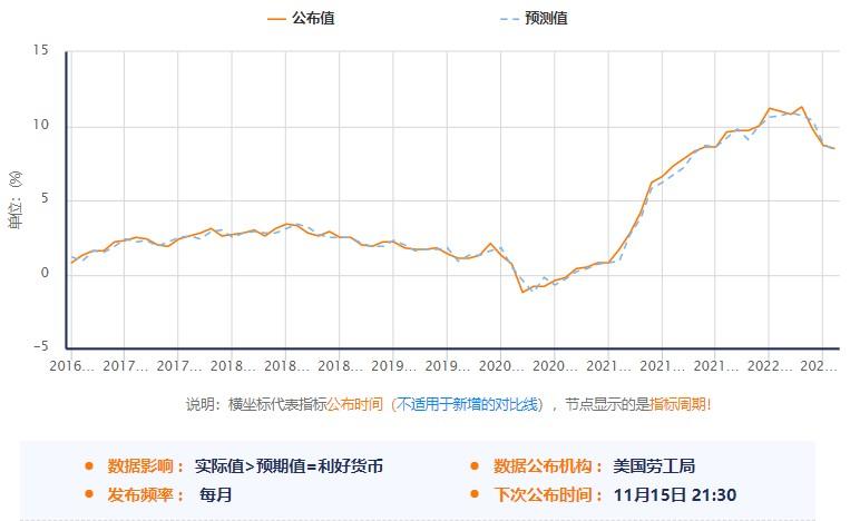 本交易日将迎来美国10月PPI数据,该数据一般在三个月左右会向CPI传导,可以作为美国通胀水平的前瞻参考指标,投资者需要重点关注。目前市场预期美国10月PPI同比增长8.3%,前值为8.5%,如果符合预期,将是连续四个月增幅放缓,偏向利空美元利多金价。