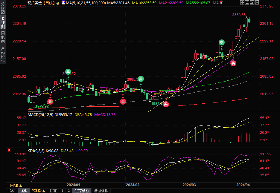 汇通财经APP讯——金价上周五(4月5日)攀升,最高触及2330.96美元/盎司,再度创下历史新高,尽管美国3月份就业增长强劲,但包括美国降息押注、投机性买盘和央行购买在内的多重因素使金价连创纪录新高,地缘政治动荡也给金价提供了强劲的上涨动能。