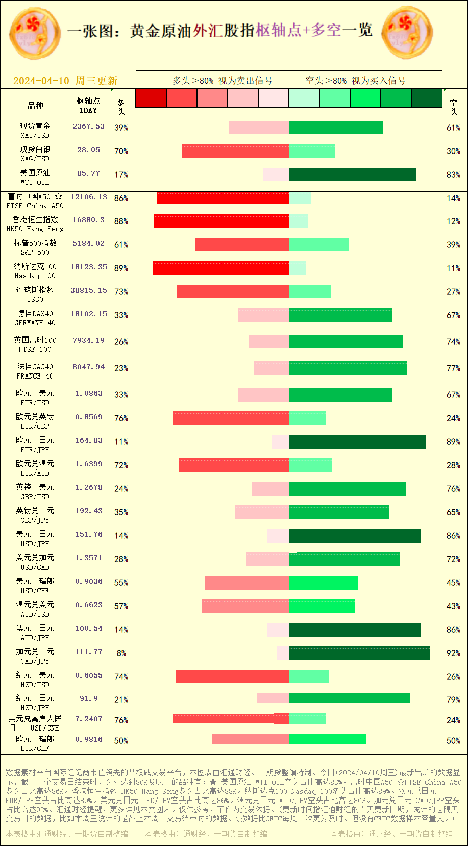 标题:一张图:2024/04/10黄金原油外汇股指"枢纽点+多空占比"一览