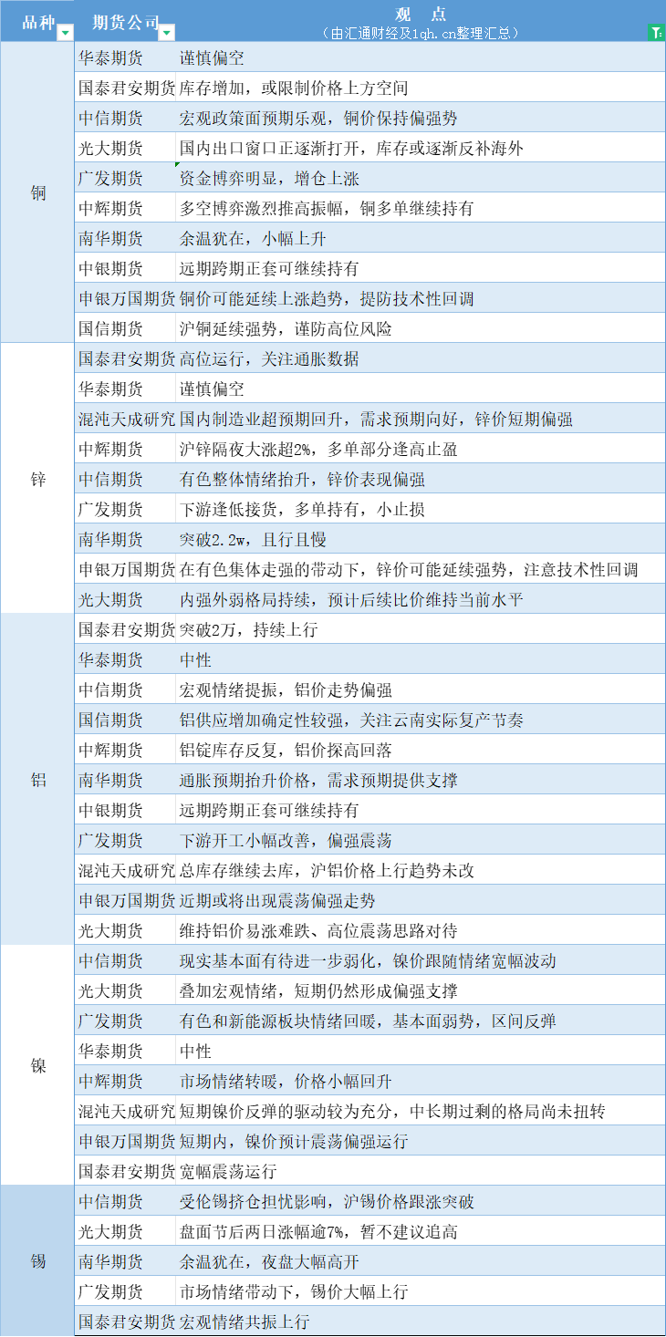 标题:期货公司观点汇总一张图:4月10日有色系(铜、锌、铝、镍、锡等)