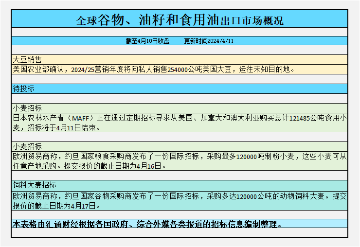 截至周三收盘,全球谷物、油籽和食用油出口市场招标、采购概况