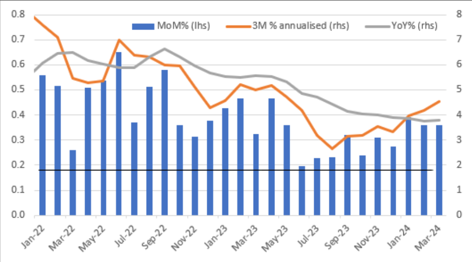 美国的通货膨胀率连续第三个月保持在环比0.4%的水平,是将通货膨胀率降至同比2%目标所需要的两倍多。对美联储6月降息的预期已经崩溃,有关利率将持续更长时间的说法已经站稳脚跟,9月将是任何政策放松的最早机会。