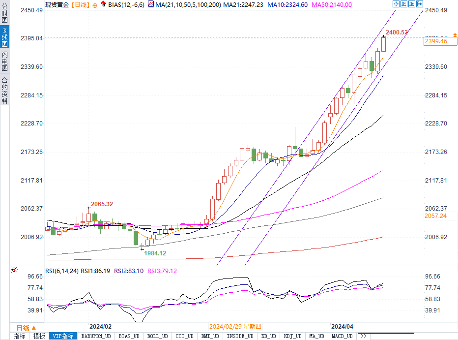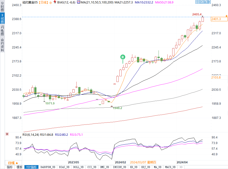 现货黄金价格一度突破2400美元,黄金期货市场呈现出活跃的态势。特别是6月合约在中国买盘增加时,触及了2405.40美元的历史新高。