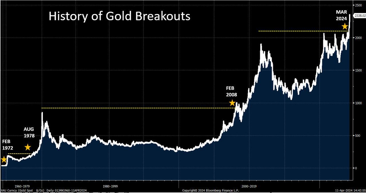 金价在历史上可以长期处于低迷状态,但一旦突破,通常上涨速度又快又猛。在决定是否追赶或消退最近的黄金涨势时,从过去的突破事件中汲取一些灵感可能会有所帮助。瑞银认为,“突破”指金价较之前历史峰值上涨10%。