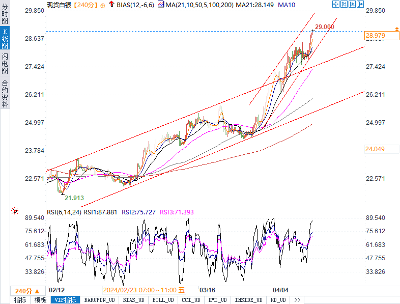 银价已成功突破首个看涨目标28.75美元/盎司,为白银的进一步上涨打开空间。白银价格继续上涨,并突破上述水平,