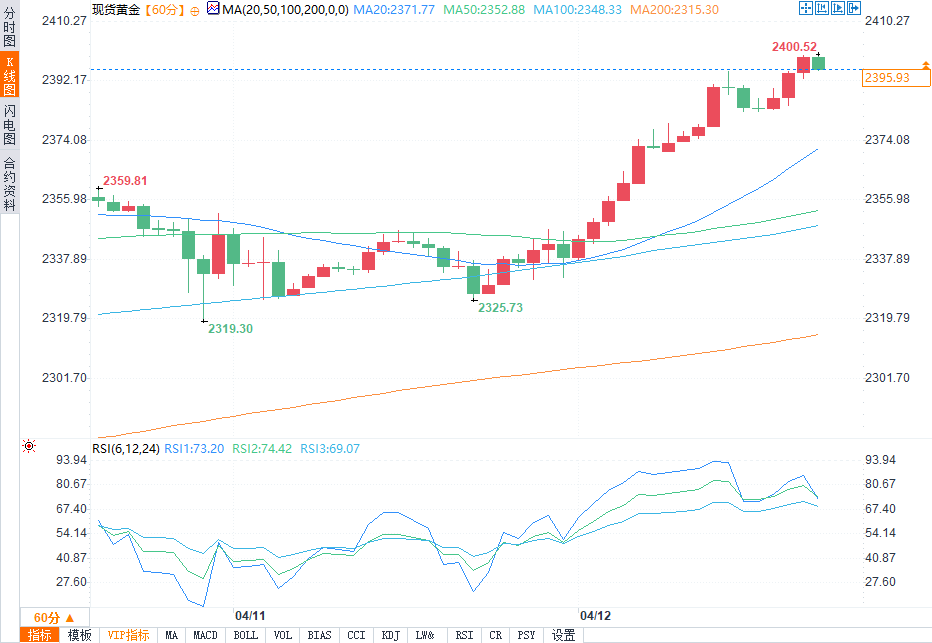 在黄金价格小时图上,金价在2385美元附近盘整后再度上涨到2400美元附近。