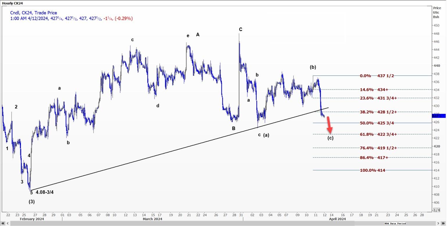 芝加哥期货交易所玉米CK24价格可能跌破每蒲式耳4.2575美元的支撑位,跌至4.2275美元。