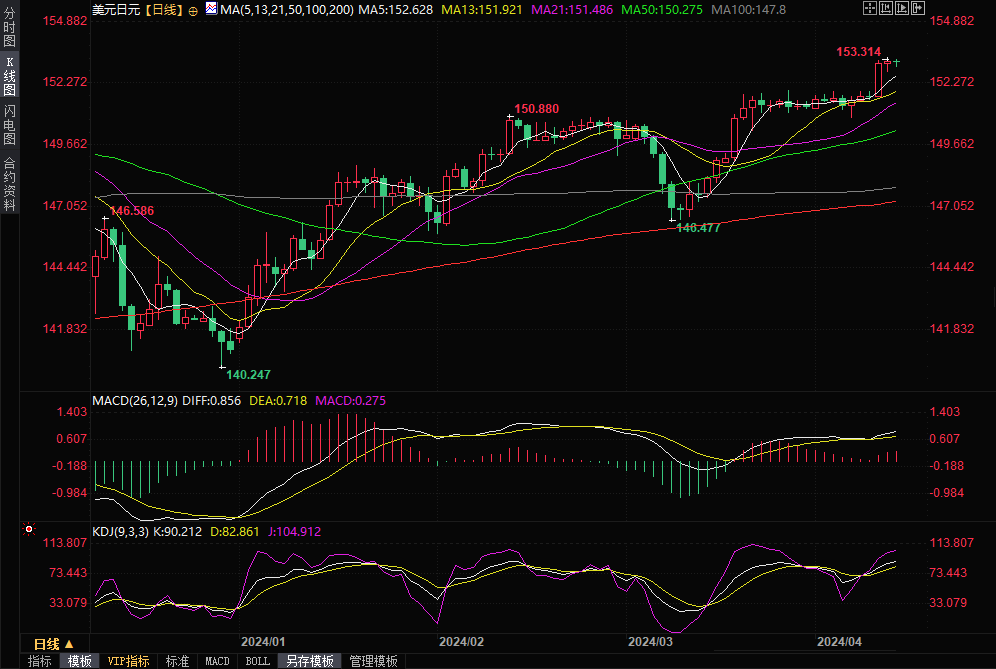 汇通财经APP讯——美元兑日元周五(4月12日)亚洲时段维持买兴,目前交投于153.22附近,接近隔夜创下的近34年新高153.31。日本当局有口头但无实际外汇干预,财务省对行动持观望态度。技术分析指出,美元/日元上升形态还没走完,多头有望冲向154。