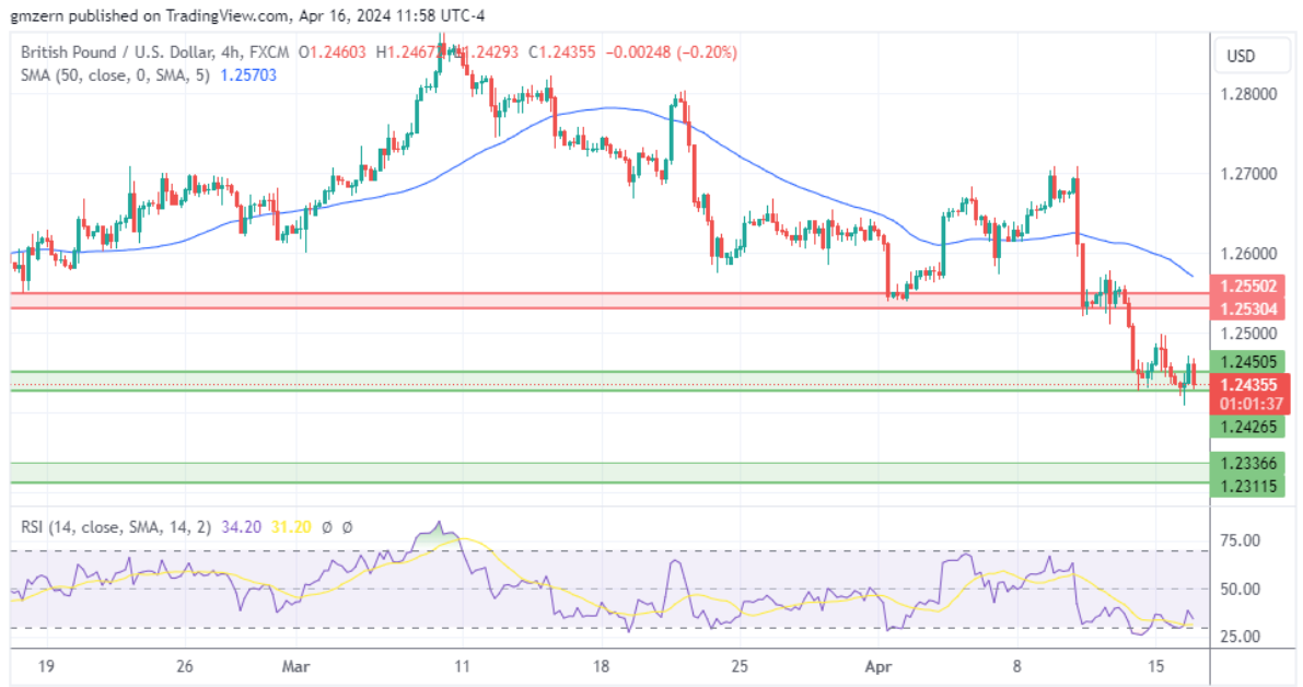 由于交易者关注英国失业率报告,英镑/美元继续试图跌破支撑位1.2425 – 1.2450。报告显示,2月份失业率从1月份的4%上升至4.2%,而分析师普遍预期为4%。