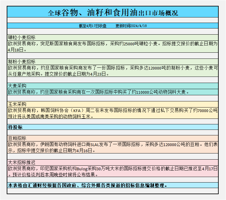 截至周三收盘,全球谷物、油籽和食用油出口市场招标、采购概况