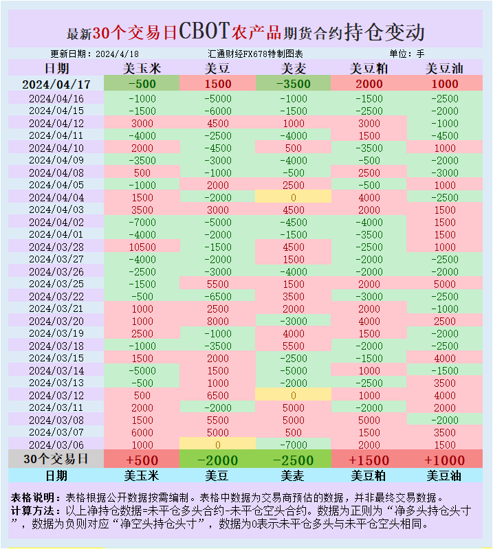 根据汇通财经观察,海外交易商估算的结果显示,本周二(4月16日),大宗商品基金增加CBOT美豆、美豆粕、美豆油投机性净多头头寸,增加美玉米、美麦投机性净空头头寸。最新30个交易日,大宗商品基金增加美豆油、美豆粕、美玉米投机性净多头头寸,增加美豆、美麦投机性净空头头寸。