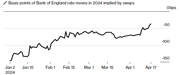 但美国的事态发展促使人们对英国央行何时采取行动的押注出现大幅波动。就在一个月前,投资者已充分考虑到12月份降息三个季度以及第四个季度的前景,关键利率从16年高点5.25%下调。现在,11月的价格仅为其中之一。