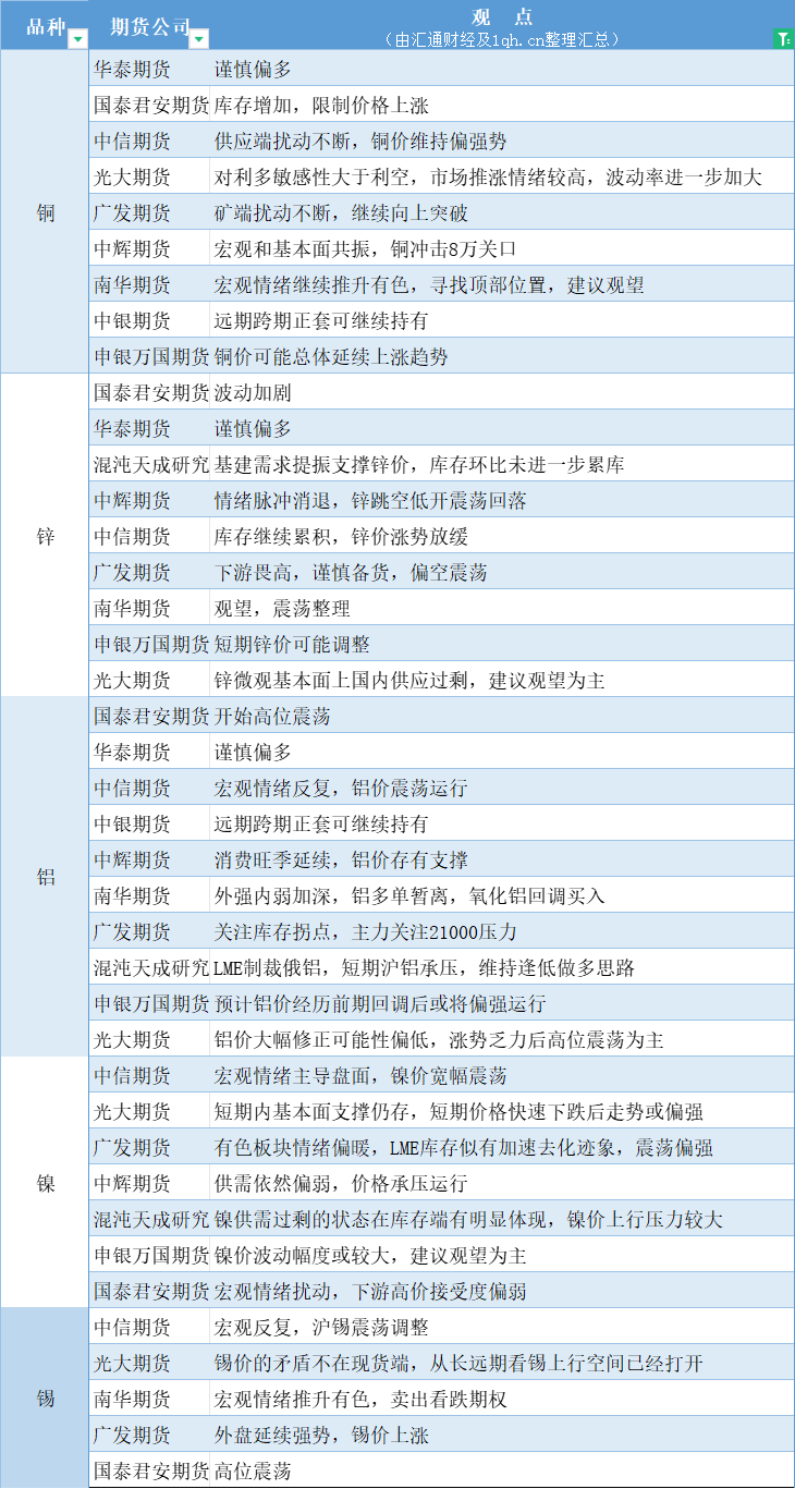 标题:期货公司观点汇总一张图:4月19日有色系(铜、锌、铝、镍、锡等)