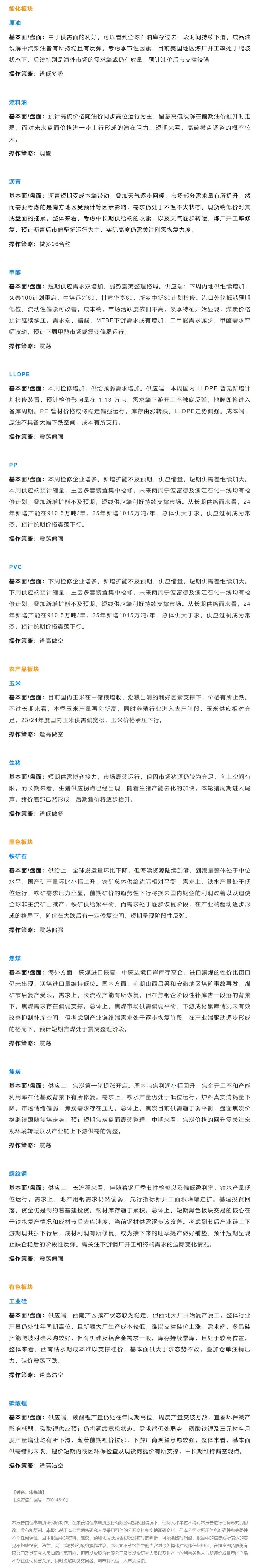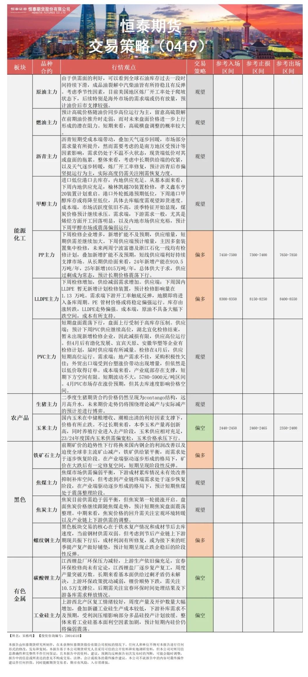 以下是恒泰期货今日早间交易策略,覆盖品种有:宏观分析、原油燃料油等能源化工、豆粕豆油大豆玉米白糖生猪等农产品、黑色系如铁矿石焦煤焦炭螺纹钢、有色系如工业硅碳酸锂等。