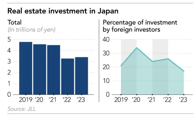 仲量联行的数据显示,外国投资者通常占日本房地产投资的20%至25%,他们往往是财力雄厚的大型投资者。Funakubo说:“他们的活动往往决定了市场的方向。”