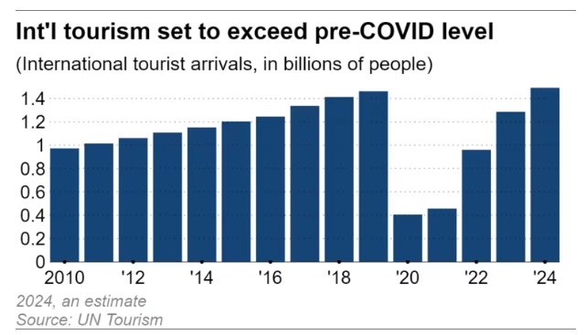 预计看涨趋势将持续下去。联合国预测,去年全球国际游客人数增长34%,达到12.9亿人,2024年将再增长16%,达到14.9亿人,超过2019年的水平。