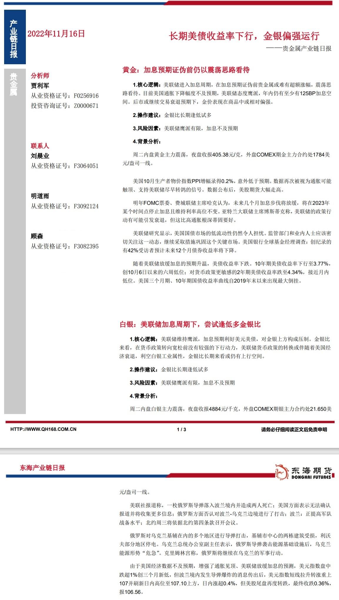 标题:【东海期货11月16日产业链日报】贵金属篇:长期美债收益率下行,金银偏强运行