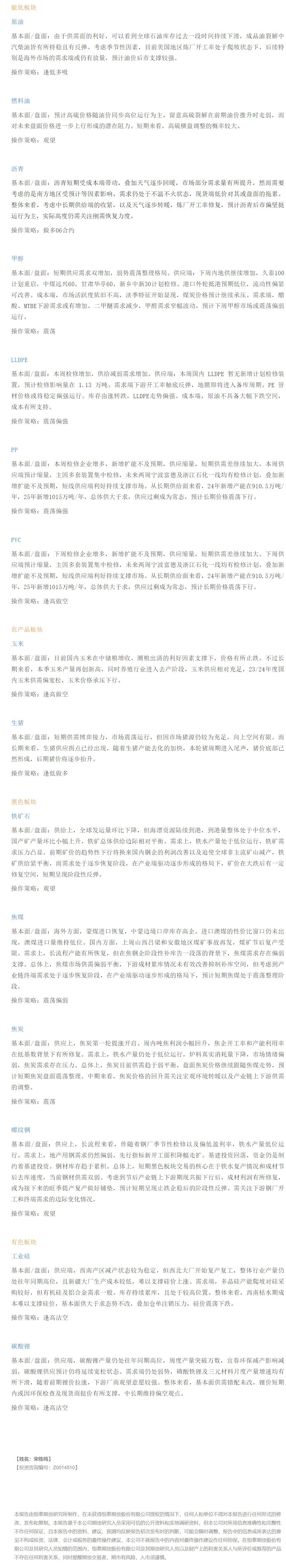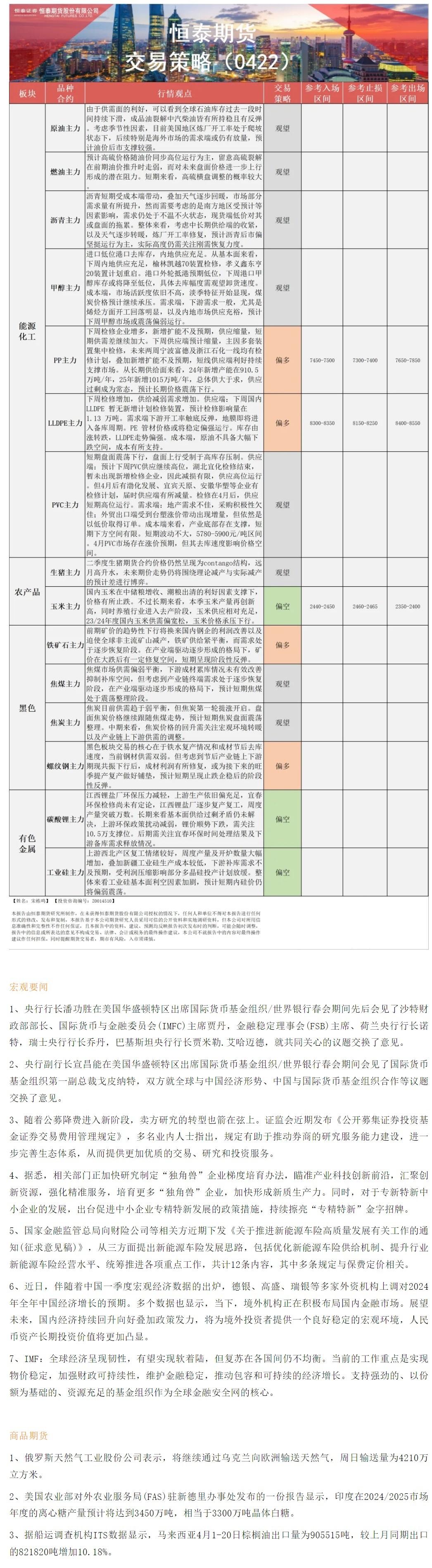 以下是恒泰期货今日早间交易策略,覆盖品种有:宏观分析、原油燃料油等能源化工、玉米生猪等农产品、黑色系如铁矿石焦煤焦炭螺纹钢、有色系如工业硅碳酸锂等。