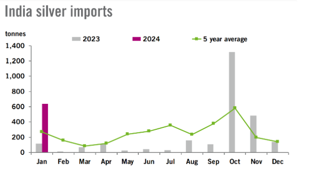 他们写道:“去年印度银器和珠宝制造业下降了25%(援引白银协会),贸易数据表明,正在补充库存,这往往有利于短期需求。白银进口在2023年第四季度有所回升,并在1月份继续(最新数据)。今年年初,印度总共进口了637吨白银,比五年平均水平高出138%,这表明在经历了低迷的一年之后,2024年的需求可能会上升。”