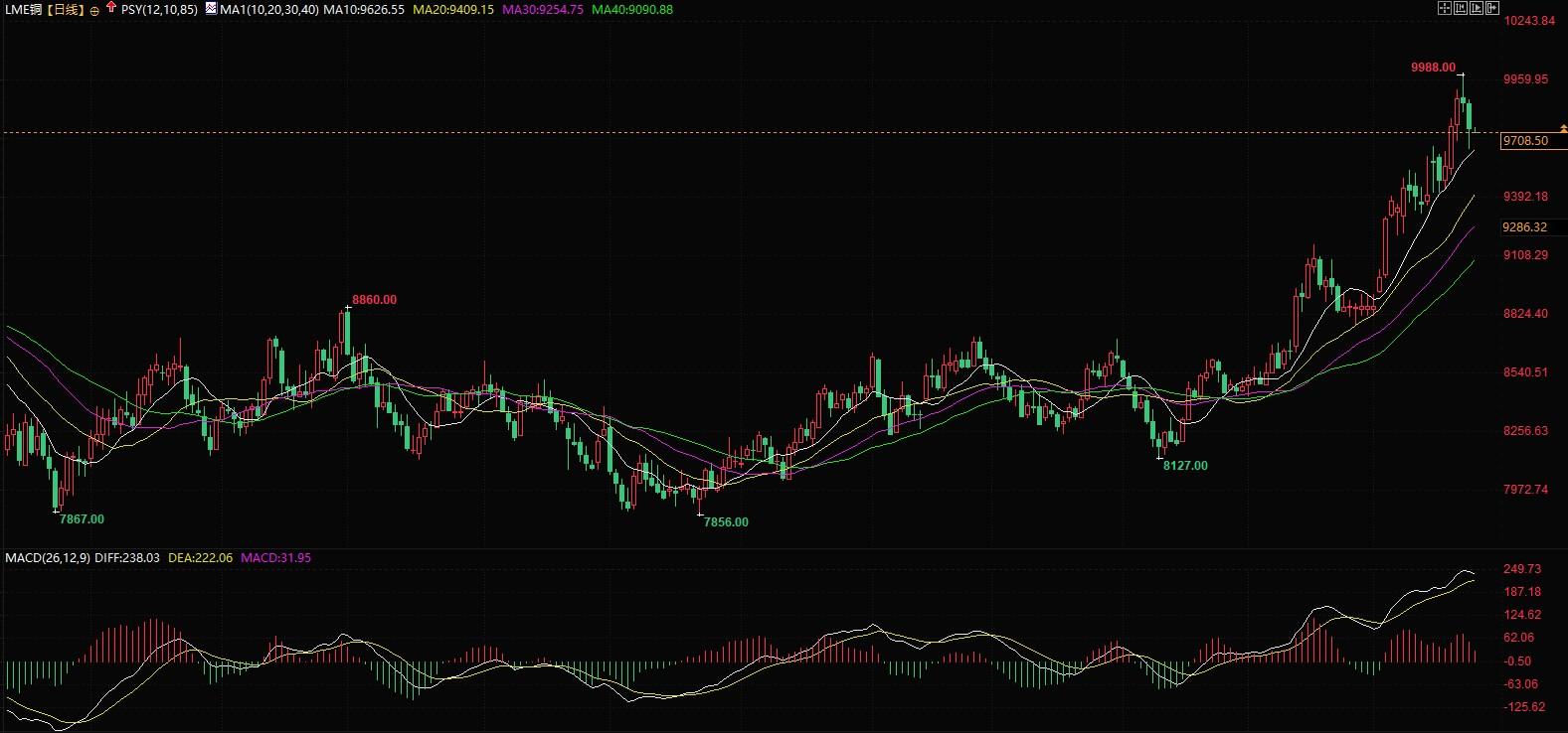 花旗建议投资者对铜头寸进行对冲,因为未来3年铜价有可能再次出现“爆炸性上涨”。花旗表示,未来三个月铜价可能触及10500美元/吨,将其第二季度和第三季度的平均价格从此前估计的950万美元/吨上调至1万美元/吨。铜价上周四触及花旗设定的每吨9741美元的目标。花旗新的短期牛市预测认为,铜价将在这段时间内飙升至每吨1.2万美元,而LME和上海期货交易所的铜库存将在未来三个月大幅下跌。