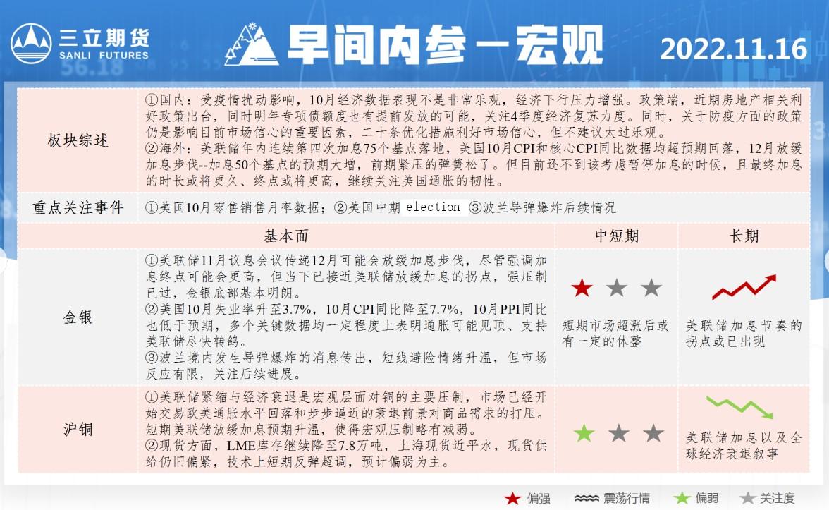 三立期货早间内参显示,金银中短线略微偏多,长线偏多,美联储加息节奏的拐点或已出现;沪铜中短线略微偏空,长线偏空,关注美联储加息和能源危机下的衰退叙事。