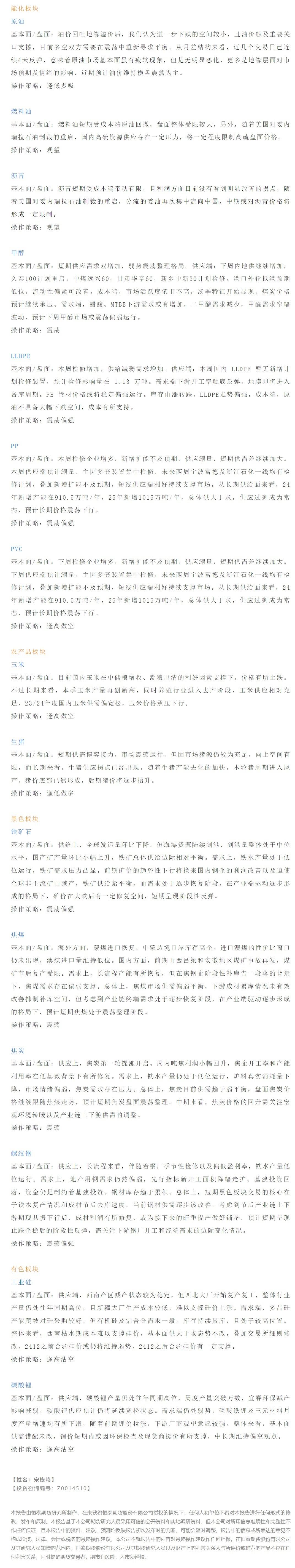 以下是恒泰期货今日早间交易策略,覆盖品种有:宏观分析、原油燃料油等能源化工、玉米生猪等农产品、黑色系如铁矿石焦煤焦炭螺纹钢、有色系如工业硅碳酸锂等。