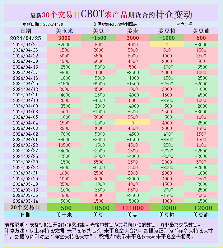 根据汇通财经观察,海外交易商估算的结果显示,本周四(4月25日),大宗商品基金增加CBOT美豆油、美玉米美麦投机性净多头头寸、增加美豆、美豆粕投机性净空头头寸。最新30个交易日,大宗商品基金增加美麦投机性净多头头寸,增加美豆、美豆油、美豆粕、美玉米投机性净空头头寸。