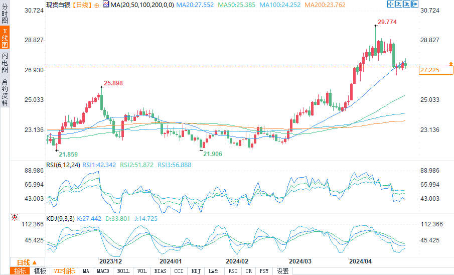 现货白银盘中报27.189美元,跌幅0.82%。3月份PCE报告比市场预期略高,这一数据落入了美国货币政策鹰派的阵营,他们希望看到美联储推迟降息。
