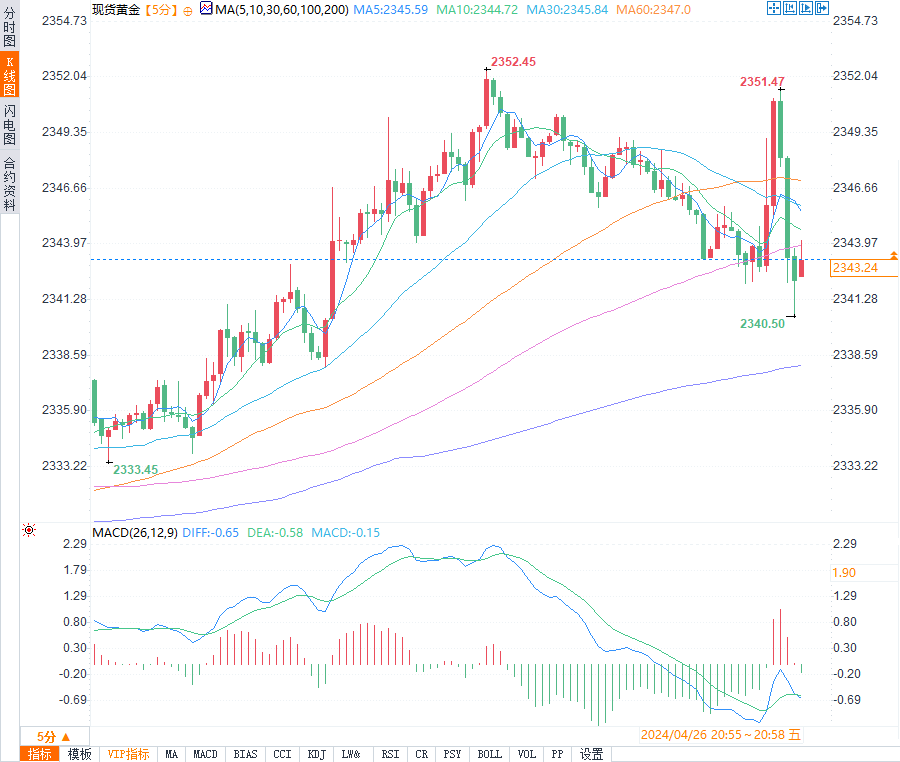 现货黄金短线走高7美元,最高触及2351.47美元/盎司,后迅速回落最低触及2340.50美元/盎司,目前震荡走高,现报2347.01美元/盎司。