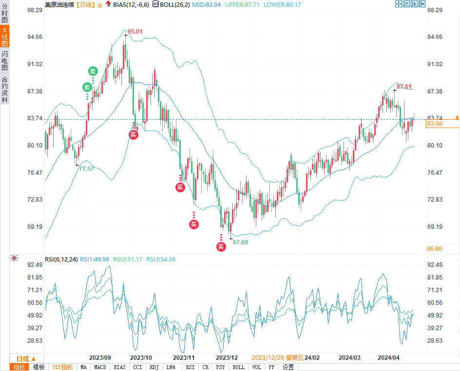 1. 油价收高:中东紧张局势的支撑本周五,原油价格收高,主要受到中东地区紧张局势的支撑。WTI 6月原油期货上涨28美分,涨幅为0.34%,收于83.85美元/桶;而