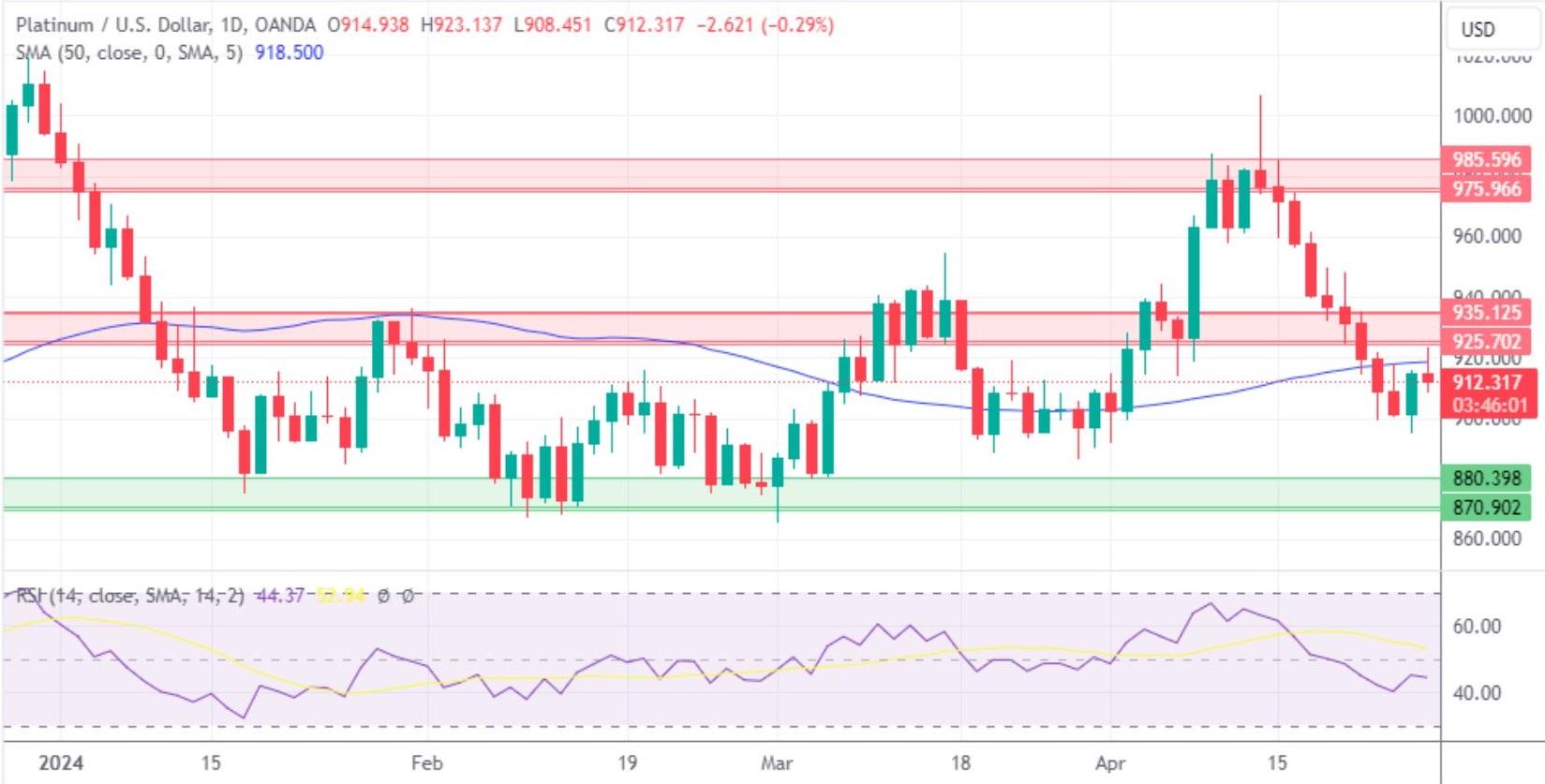 铂金在未能站稳最近的925美元至935美元的阻力位后回落。如果跌破910美元水平,将把铂金推向心理关键的900美元水平。