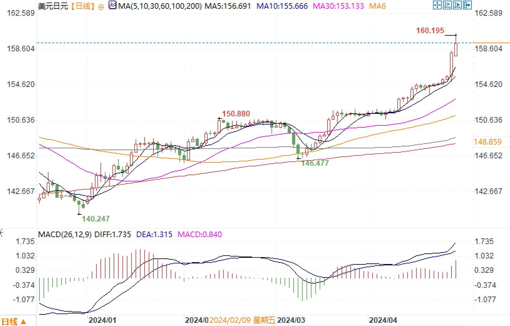 美元兑日元纽约盘尾上涨1.3%收盘于158.33,稍早曾创下158.43的1990年6月以来新高。日本央行在为期两天的政策会议结束时宣布维持利率不变,但暗示未来将加息。日本央行本次会议继续引发投机交易推低日元。此外,美国通胀数据没有显示出放缓迹象,3月个人消费支出(PCE)物价指数环比上升0.3%,符合预期,同比上升2.7%,预期为2.6%。PCE物价指数是美联储衡量是否实现其2%的目标而追踪的通胀指标之一。虽然周五的结果并不像大家传的那么热,但严峻的现实是,自2024年初以来,美联储青睐的通胀指标的短期趋势一直在稳步上行。由此引发市场确认了美联储可能推迟到今年晚些时候降息的预期,并预计美联储将在5月份的利率会议上会有鹰派的调子出现。当下的情形是,美国通胀具黏性、美日公债利差悬殊,日本通胀数据良性,日本央行周五鸽派按兵不动,日元将遭到继续削弱。但因为美元/日元涨势过快过猛,警惕日本央行下场实施实际交易性干预行动风险的出现。目前投机交易的上方目标预料瞄准着160水平,技术图形上布林带通道喇叭口扩张之中,技术指标均呈上摆之中,显示美元多头仍占主导地位。之前认为是警戒阻力水平的155将成为初步的支撑位置。