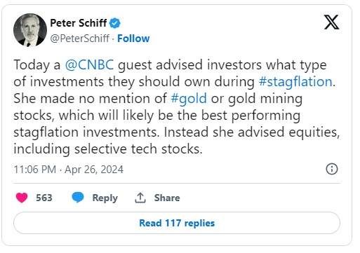 希夫甚至贬低了一位在CNBC上露面的分析师,因为这位分析师没有建议在滞胀期间持有黄金或金矿股,而是建议买入“股票,包括选择性的科技股”,正如他在4月26日的X帖子中所写的那样。