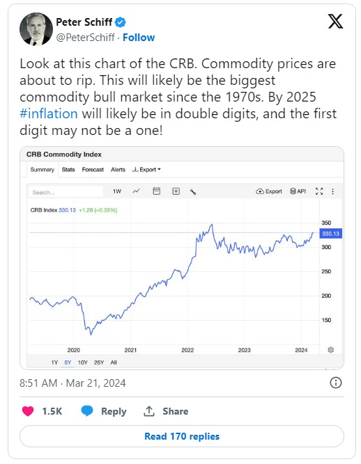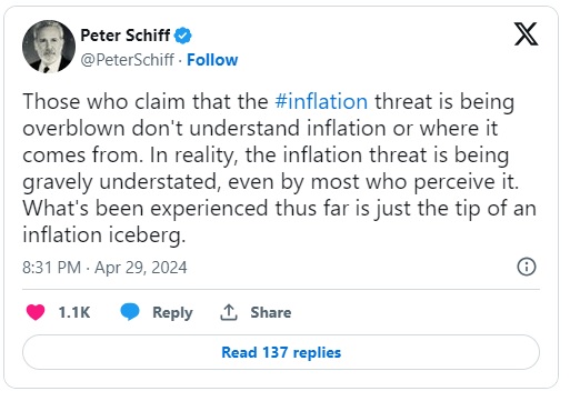根据欧洲太平洋资产管理公司(Euro Pacific Asset Management)CEO兼首席全球策略师彼得·希夫4月29日在社交媒体X平台上的帖子,他强调了那些试图平息通胀担忧的人“严重低估”通胀威胁,将这种不相信归因于缺乏理解,并认为目前的情况“只是通胀的冰山一角”。