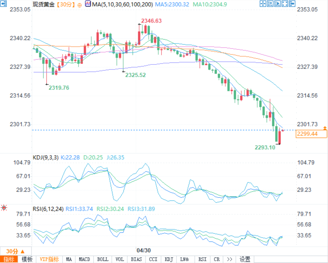 现货黄金报2297.64美元/盎司,跌幅1.6%。