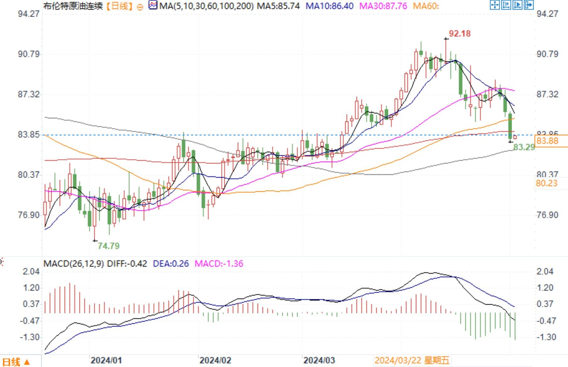 布伦特原油连续 报 83.88 美元/桶。