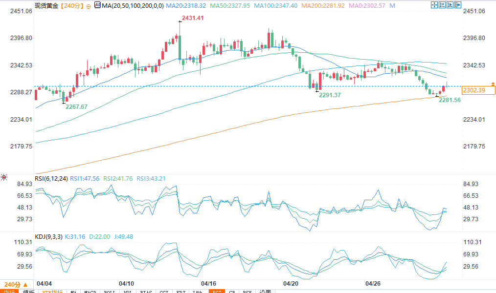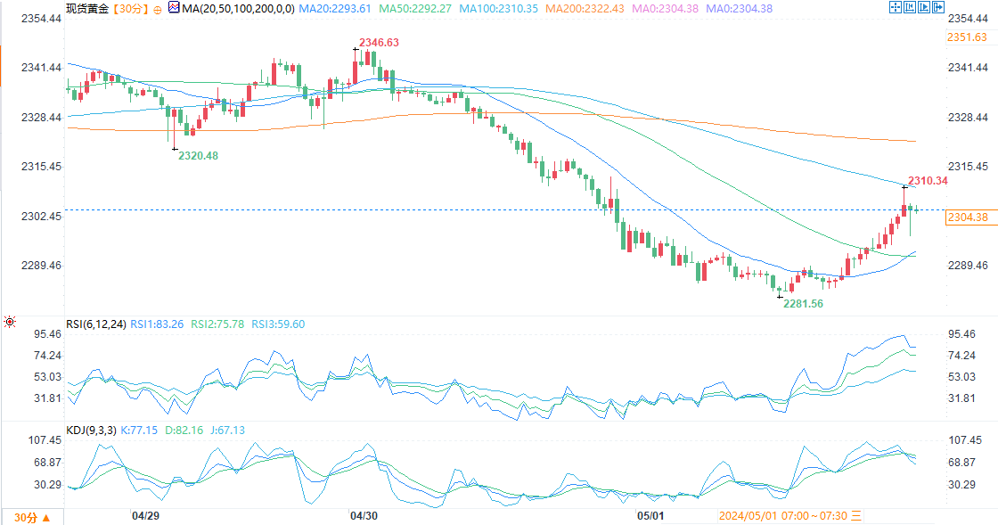 市场反应现货黄金一度拉涨至日内高点2310.51,现报2300.04美元/盎司,日内涨幅0.63%。
