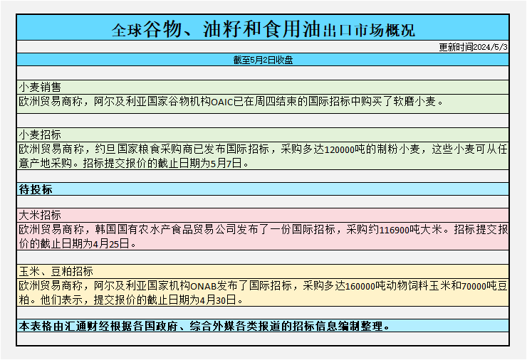截至周四收盘,全球谷物、油籽和食用油出口市场招标、采购概况