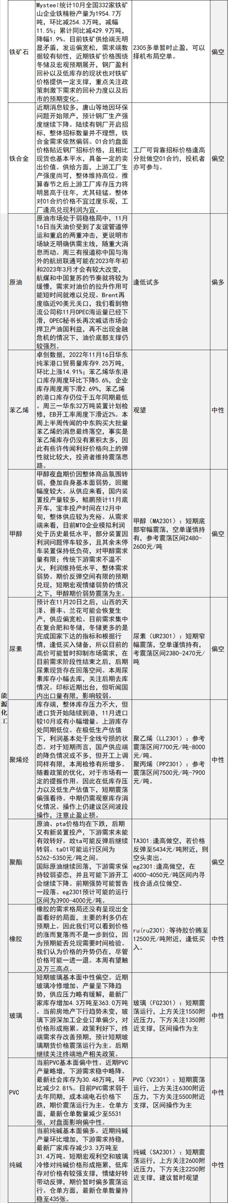 德国天然气库存率达100%,友谊管道重启拖累油价,底部支撑犹存。国际原油期货周三下跌,因有报道称俄罗斯至欧洲的输油管道已经重启,加之围绕波兰边境爆炸事件的紧张局势缓解,市场注意力回到需求面。原油市场处于弱稳格局中,11月16日当天油价受到了友谊管道停运和重启的两重冲击,更说明市场缺乏明确供需主线,随重大消息而动。周三有报道称中国与海外的航班联通可能在2023年年初和2023年3月才会有较大改变,航煤和中国复苏的节奏就将较为缓慢,需求对价的拉升作用可能短时间就难以兑现。Brent再度临近90美元关口,我们看到物流公司称11月OPEC海运量已经下滑,OPEC秘书长再次喊话市场会捍卫产油国利益,再不出现金融危机的情况下,油价底部支撑仍较强烈。