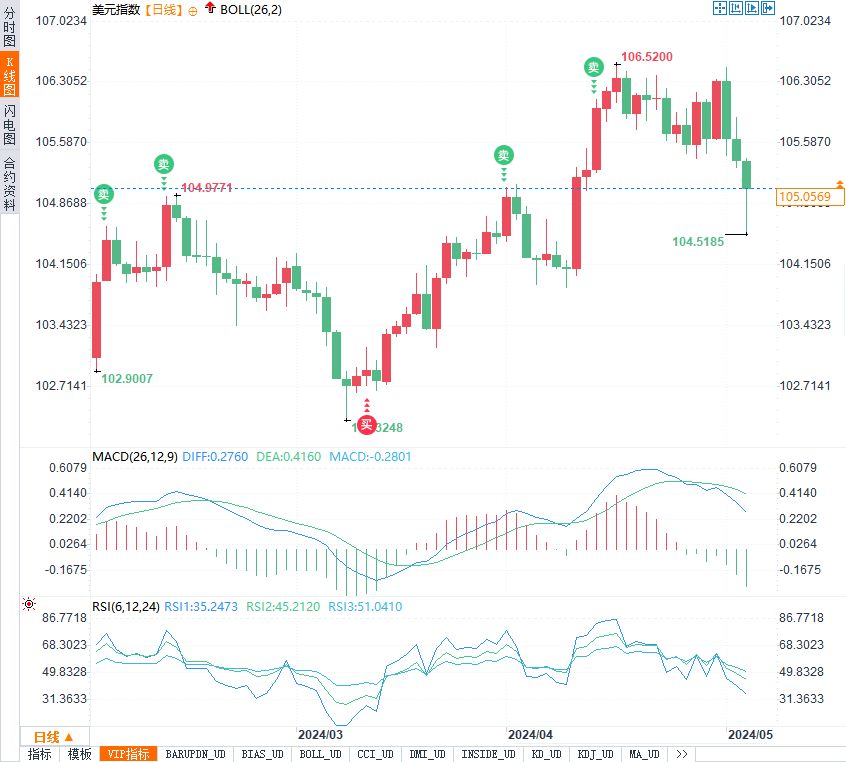 美元指数在近期表现出连续下跌的趋势,跌至4月中旬的水平。这一变化与美国4月份非农就业数据的不佳表现密切相关,该数据显示仅增加了175,000个就业岗位,低于预期。此外,失业率保持在3.9%,尽管低于许多人的预期,但未能显著下降。这些经济指标的表现影响了投资者对美国经济前景的预期,进而对