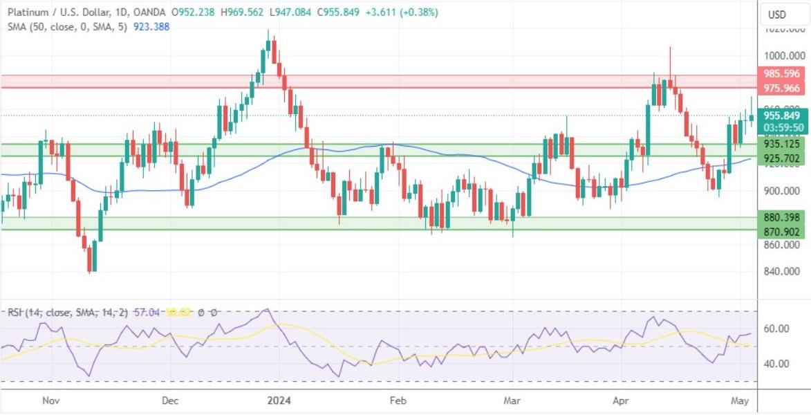 随着需求增强的预期持续,铂金测试了新高。如果铂金成功站稳在960美元以上,将朝着975 - 985美元的阻力位前进。