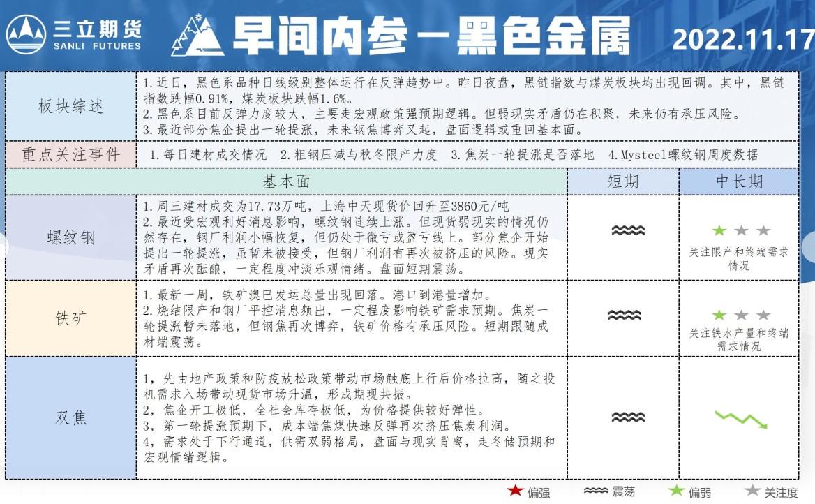 三立期货早间内参显示,螺纹钢短线偏向多头,中长线略微偏空,关注限产和终端需求情况;铁矿石短线偏向震荡,中长线略微偏空,关注铁水产量和终端需求;双焦短线短线偏向震荡,中长线偏向空头。