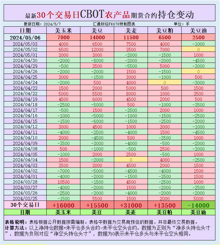 根据汇通财经观察,海外交易商估算的结果显示,本周一(5月6日),大宗商品基金增加CBOT美豆、美玉米、美麦、美豆粕、美豆油投机性净多头头寸。最新30个交易日,大宗商品基金增加美豆、美豆粕、美麦、美玉米投机性净多头头寸,增加美豆油投机性净空头头寸。