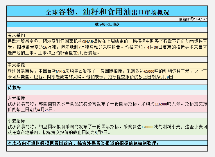 截至周一(5月6日)收盘,全球谷物、油籽和食用油出口市场招标、采购概况