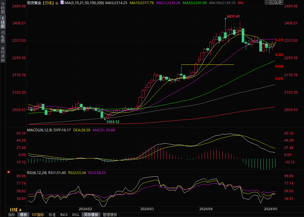 现货黄金目前交投于2323.45美元/盎司附近,因最近的经济数据加强了对美联储将在今年晚些时候降息的预期。另外,中东地缘局势趋于紧张,也给金价提供上涨动能。