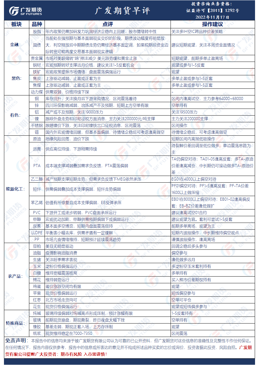 广发期货发布11月17日早评,建议贵金属短期观望,前期多单止盈离场,钢材观望或参与1-5反套,煤焦多单止盈或参与1-5正套,铜区间内逢高试空,主力参考64000-68000,原油短期区间内高抛低吸操作。
