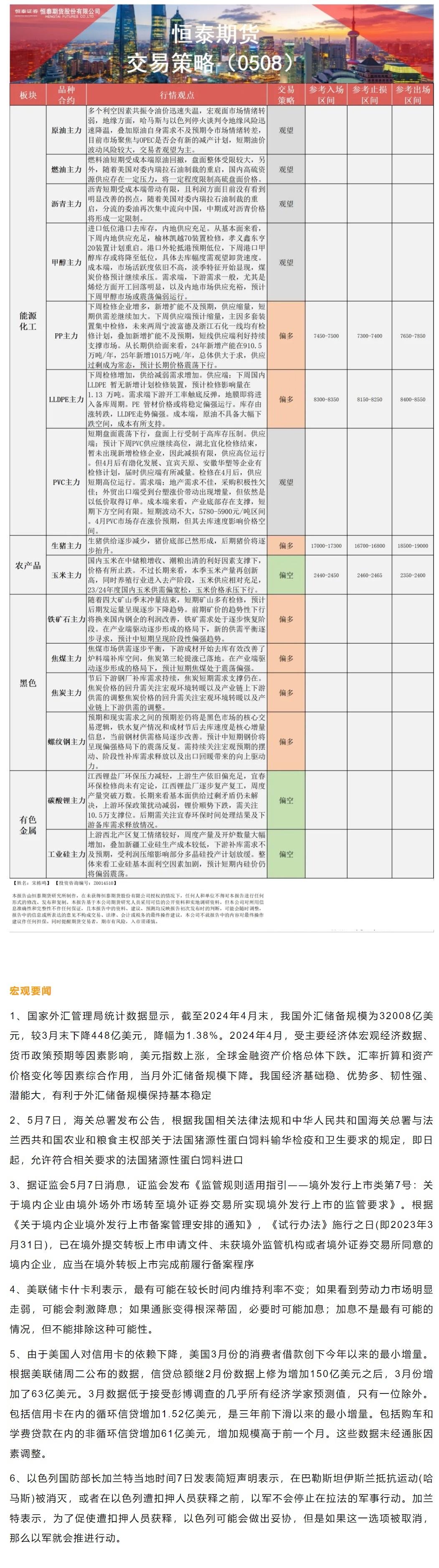 以下是恒泰期货今日早间交易策略,覆盖品种有:宏观分析、原油燃料油等能源化工、玉米生猪等农产品、黑色系如铁矿石焦煤焦炭螺纹钢、有色系如工业硅碳酸锂等。