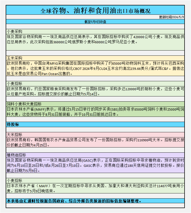 全球谷物、油籽和食用油出口市场招标、采购概况追踪(2024/05/09)